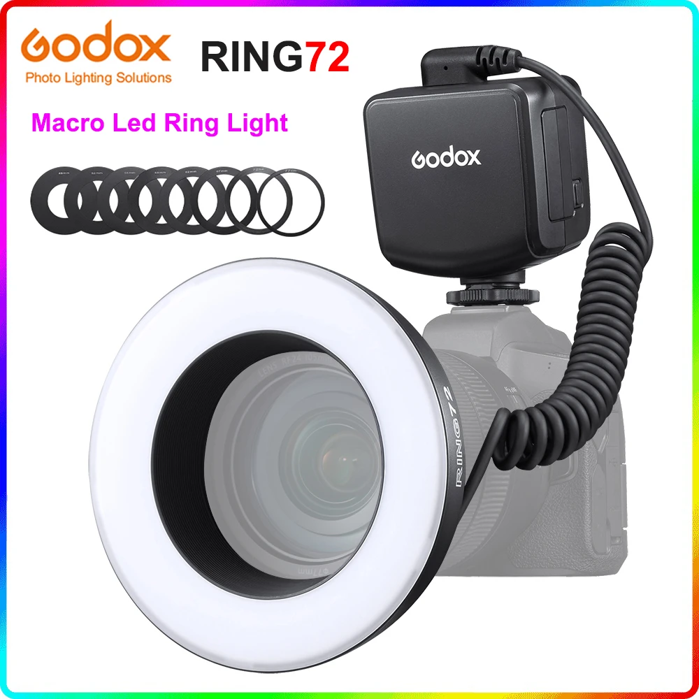 Godox Ring72 8w 5600k Macro Led Ring Light Cri 96 8 Lens Adapter Rings Separate Brightness Control For Canon Nikon Dslr Cameras Photographic Lighting Aliexpress